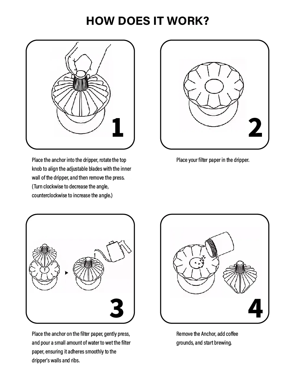 The Anchor es un accesorio aliado para baristas que buscan la perfección en sus métodos de vertido manual. Esta herramienta ayuda a disminuir el problema del desvío de agua (bypass), asegurando que el papel de filtro se asiente firmemente contra las paredes del dripper, eliminando bolsas de aire y optimizando el flujo de extracción para un sabor más limpio y balanceado.